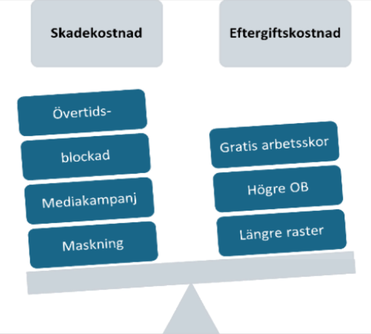 För att vara mer konkret är det viktigt att bedöma det vi kallar påtryckningsbalansen eller maktbalansen. För arbetsköparen innebär det ofta en kostnad att ge efter för våra krav, en eftergiftskostnad. Det kan vara exempelvis krav på gratis arbetsskor, högre OB-tillägg och längre raster.