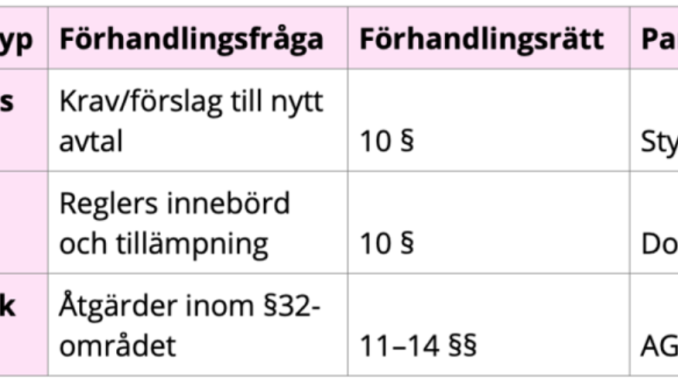 Tabellen visar vilka frågor som omfattas av respektive förhandlingstyp, den rättsliga grunden i MBL samt hur lagstiftaren vill att förhandlingar som avslutas i oenighet ska hanteras.