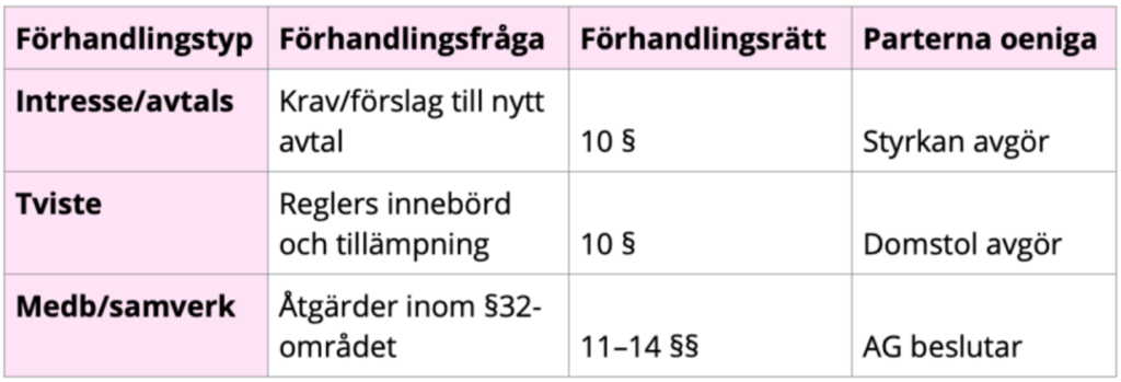 Tabellen visar de tre typerna av förhandlingar: intresseförhandling, tvisteförhandling och medbestämmandeförhandling. Intresseförhandling benämns även avtalsförhandling. Medbestämmandeförhandling kallas även samverkansförhandling.