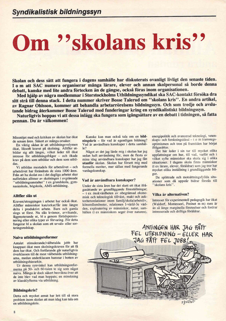 Skola och utbildning är ständigt aktuella ämnen i samhällsdebatten. Ibland dyker den mer högtidliga termen ”bildning” också upp. Men i början av 1980-talet, innan marknadsskolan och ropen på ”mer ordning och disciplin” blev de centrala spåren att förhålla sig till i debatten, förde några syndikalister en diskussion om bildningssyn i tidningen Syndikalistens föregångare SAC-Kontakt. Här publicerar vi en tillbakablick på deras inlägg.